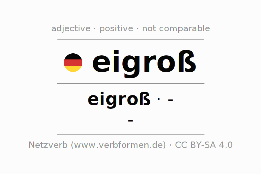 The declension of the adjective eigroß (egg-sized) uses the incomparable form eigroß. The adjective has no forms for the comparative and superlative. The adjective eigroß can be used both attributively in front of a noun as well as predicative in conjunction with a verb.One can not only inflect and compare eigroß, but all German adjectives. Comments ☆