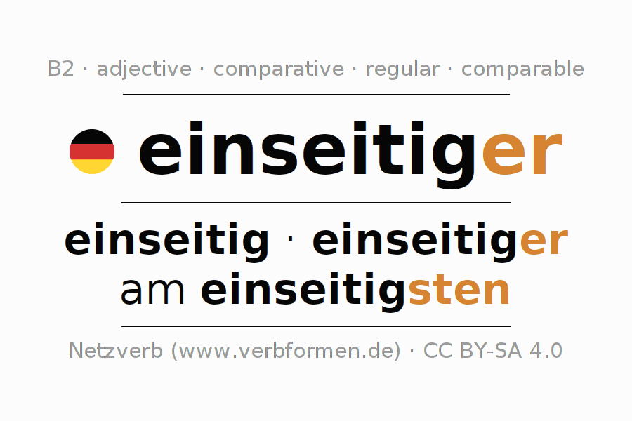 The declension of the adjective einseitiger (biased, one-sided) uses these forms of the comparison einseitig,einseitiger,am einseitigsten. The endings for the comparison in the comparative and superlative are er/sten. The adjective einseitiger can be used both attributively in front of a noun as well as predicative in conjunction with a verb.One can not only inflect and compare einseitiger, but all German adjectives. Comments ☆