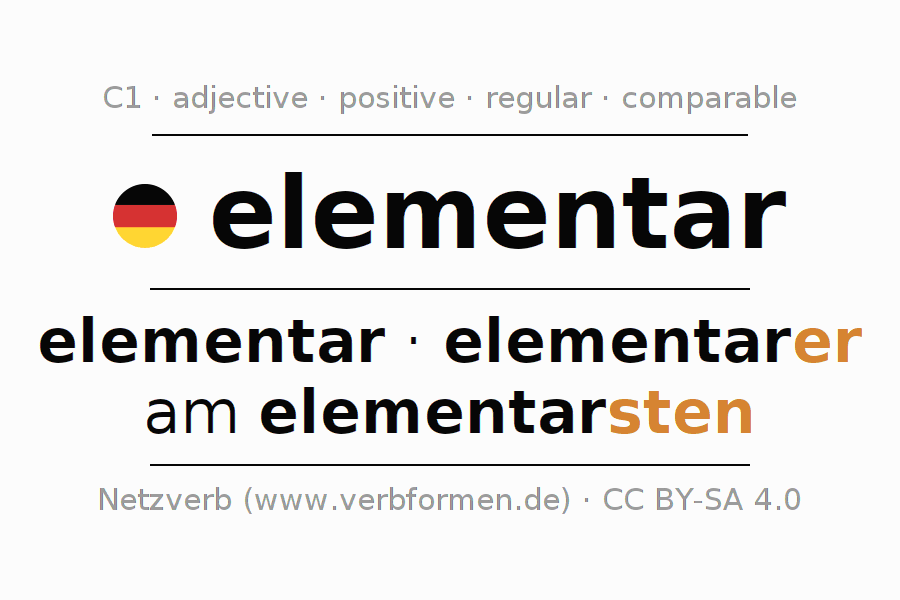 The declension of the adjective elementar (fundamental, elementary) uses these forms of the comparison elementar,elementarer,am elementarsten. The endings for the comparison in the comparative and superlative are er/sten. The adjective elementar can be used both attributively in front of a noun as well as predicative in conjunction with a verb.One can not only inflect and compare elementar, but all German adjectives. Comments ☆