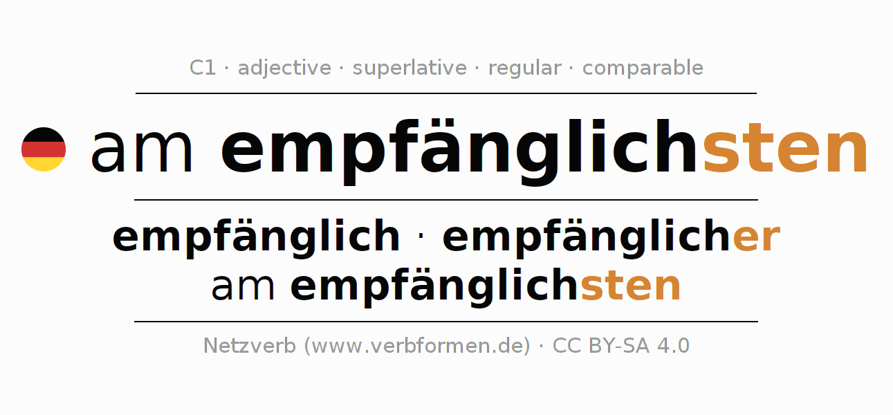 The declension of the adjective am empfänglichsten (open, receptive) uses these forms of the comparison empfänglich,empfänglicher,am empfänglichsten. The endings for the comparison in the comparative and superlative are er/sten. The adjective am empfänglichsten can be used both attributively in front of a noun as well as predicative in conjunction with a verb.One can not only inflect and compare am empfänglichsten, but all German adjectives. Comments ☆