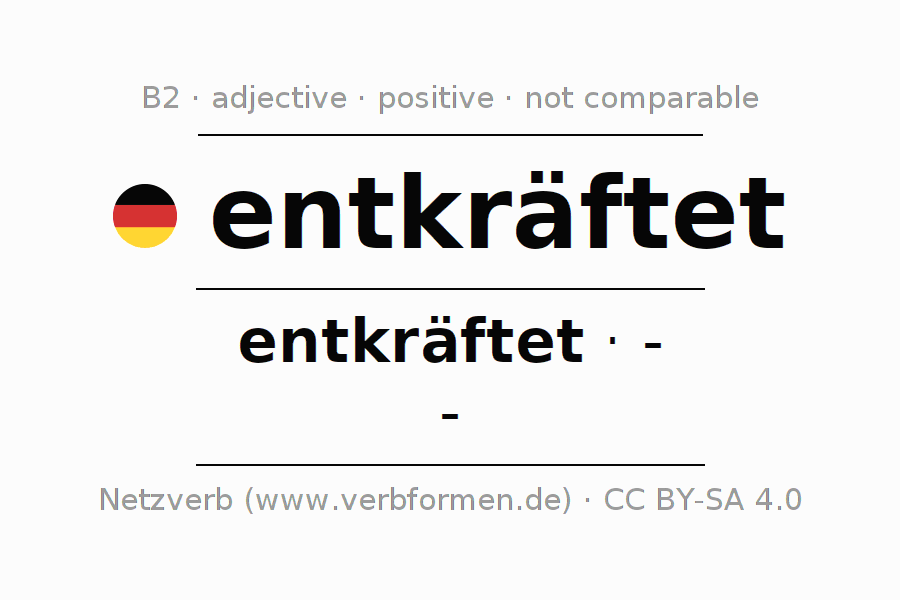 The declension of the adjective entkräftet (debilitated, exhausted) uses the incomparable form entkräftet. The adjective has no forms for the comparative and superlative. The adjective entkräftet can be used both attributively in front of a noun as well as predicative in conjunction with a verb.One can not only inflect and compare entkräftet, but all German adjectives. Comments ☆
