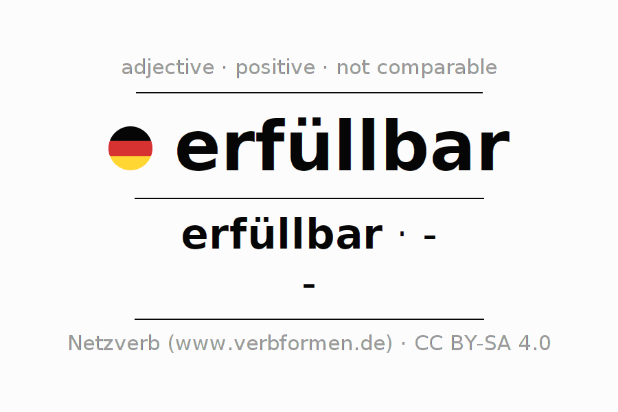 The declension of the adjective erfüllbar (achievable, fulfillable) uses the incomparable form erfüllbar. The adjective has no forms for the comparative and superlative. The adjective erfüllbar can be used both attributively in front of a noun as well as predicative in conjunction with a verb.One can not only inflect and compare erfüllbar, but all German adjectives. Comments ☆