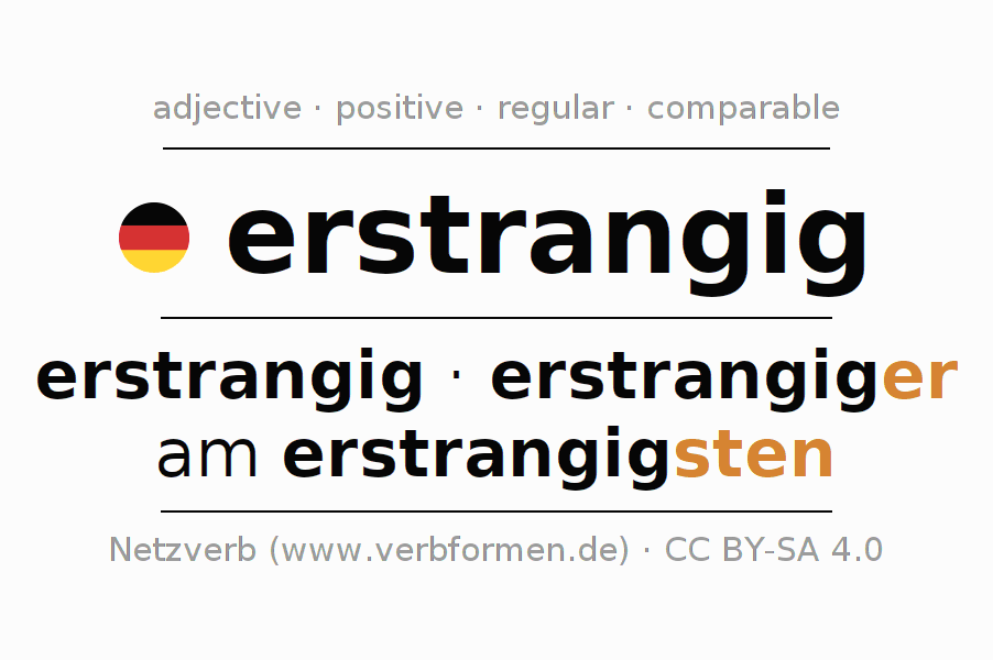 The declension of the adjective erstrangig (first-class, primary) uses these forms of the comparison erstrangig,erstrangiger,am erstrangigsten. The endings for the comparison in the comparative and superlative are er/sten. The adjective erstrangig can be used both attributively in front of a noun as well as predicative in conjunction with a verb.One can not only inflect and compare erstrangig, but all German adjectives. Comments ☆