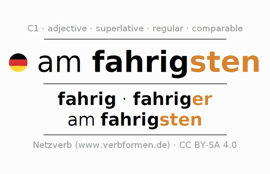 The declension of the adjective am fahrigsten (erratic, absent-minded) uses these forms of the comparison fahrig,fahriger,am fahrigsten. The endings for the comparison in the comparative and superlative are er/sten. The adjective am fahrigsten can be used both attributively in front of a noun as well as predicative in conjunction with a verb.One can not only inflect and compare am fahrigsten, but all German adjectives. Comments ☆