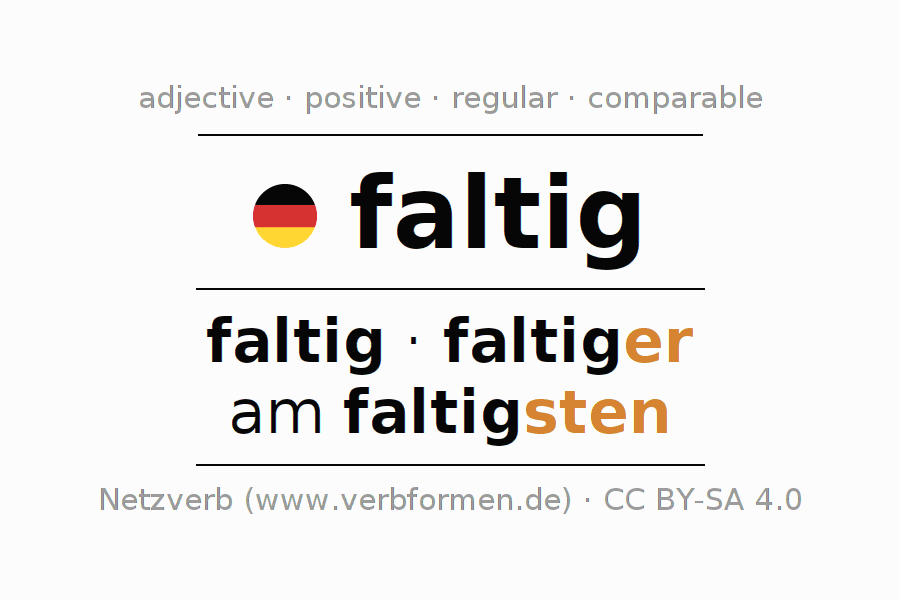 The declension of the adjective faltig (wrinkled, creased) uses these forms of the comparison faltig,faltiger,am faltigsten. The endings for the comparison in the comparative and superlative are er/sten. The adjective faltig can be used both attributively in front of a noun as well as predicative in conjunction with a verb.One can not only inflect and compare faltig, but all German adjectives. Comments ☆