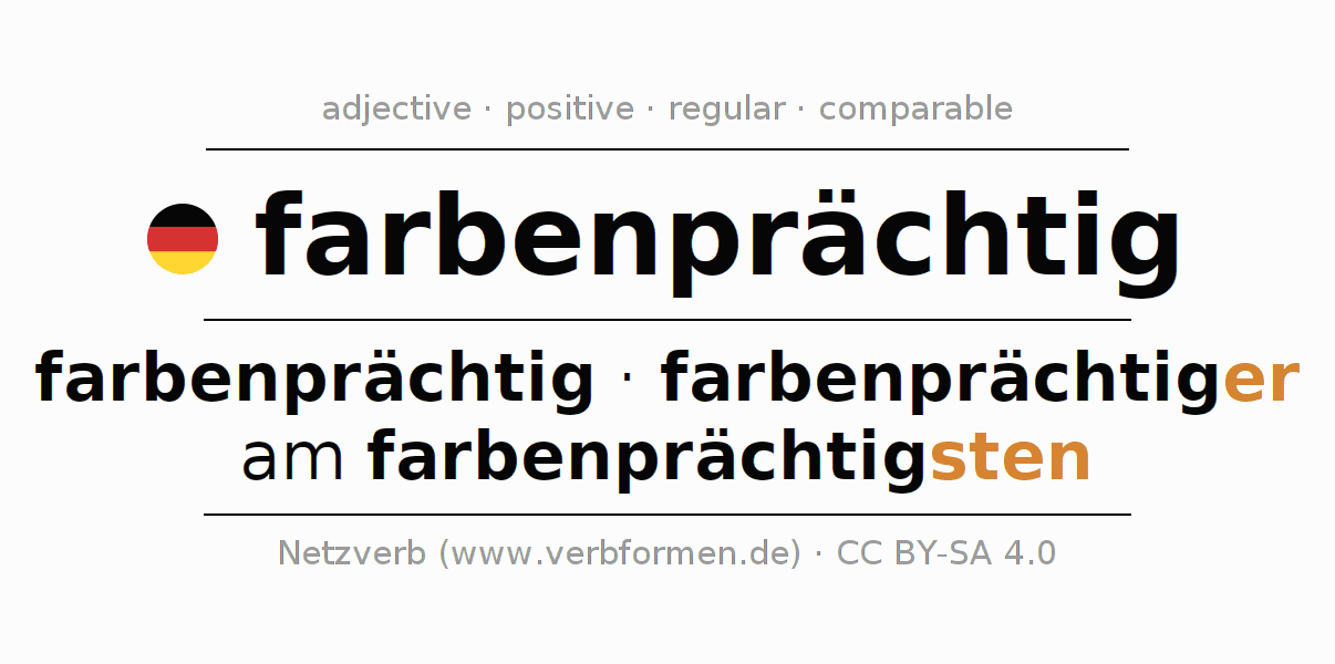 The declension of the adjective farbenprächtig (colorful, vivid) uses these forms of the comparison farbenprächtig,farbenprächtiger,am farbenprächtigsten. The endings for the comparison in the comparative and superlative are er/sten. The adjective farbenprächtig can be used both attributively in front of a noun as well as predicative in conjunction with a verb.One can not only inflect and compare farbenprächtig, but all German adjectives. Comments ☆