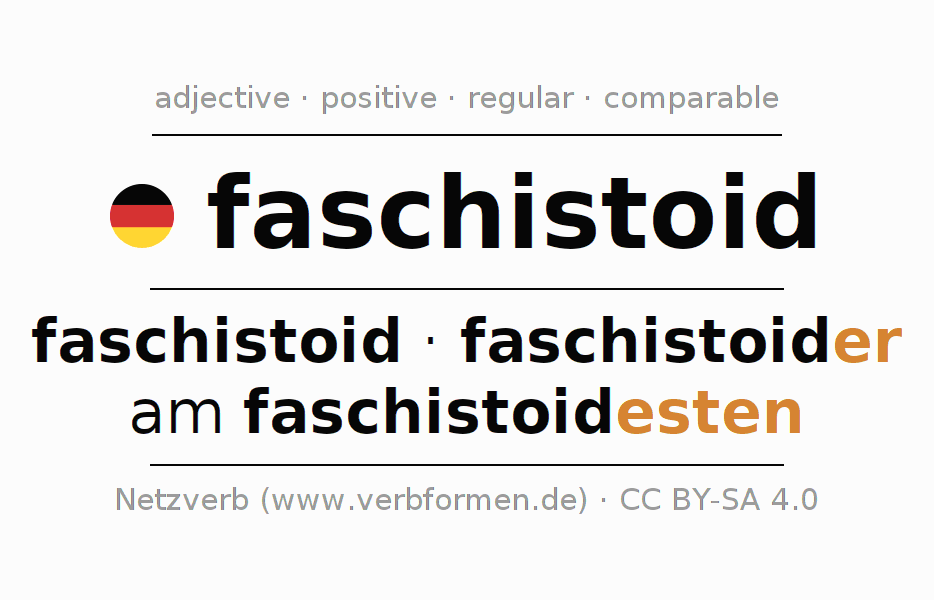 The declension of the adjective faschistoid (fascistic, fascist-like) uses these forms of the comparison faschistoid,faschistoider,am faschistoidesten. The endings for the comparison in the comparative and superlative are er/esten. The adjective faschistoid can be used both attributively in front of a noun as well as predicative in conjunction with a verb.One can not only inflect and compare faschistoid, but all German adjectives. Comments ☆