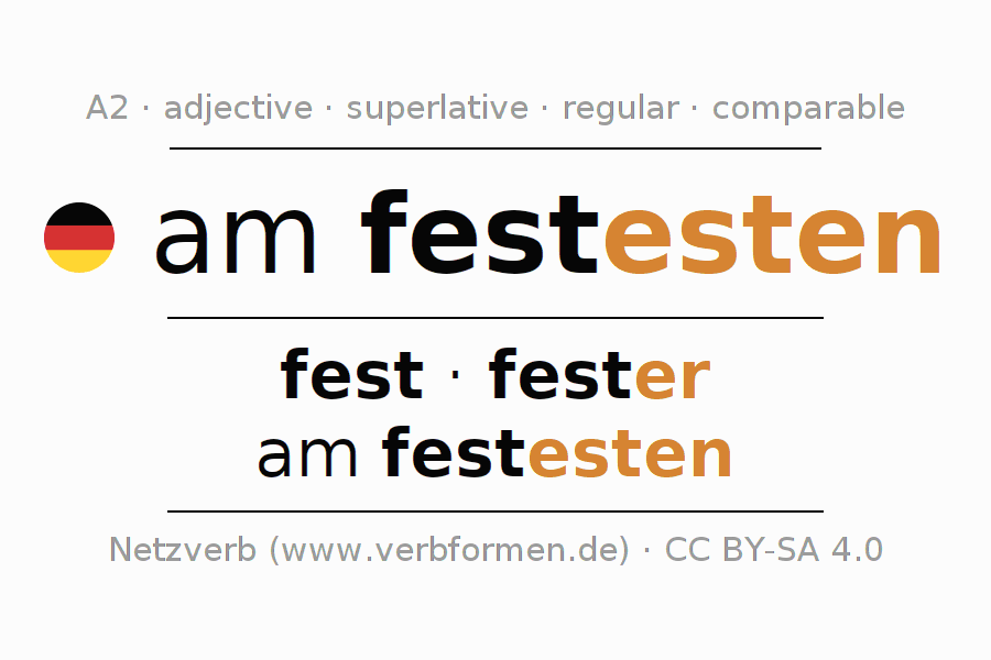 The declension of the adjective am festesten (firm, fixed) uses these forms of the comparison fest,fester,am festesten. The endings for the comparison in the comparative and superlative are er/esten. The adjective am festesten can be used both attributively in front of a noun as well as predicative in conjunction with a verb.One can not only inflect and compare am festesten, but all German adjectives. Comments ☆