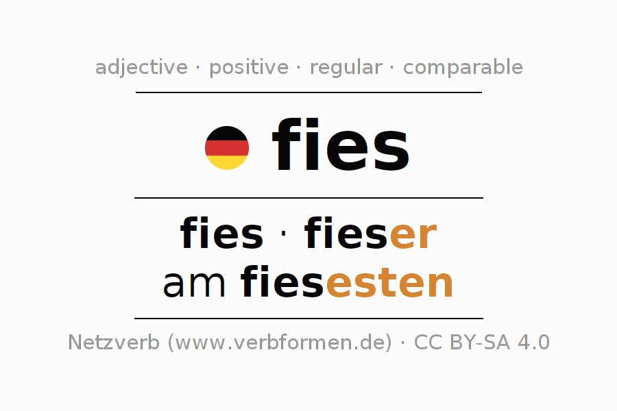 The declension of the adjective fies (nasty, mean) uses these forms of the comparison fies,fieser,am fiesesten. The endings for the comparison in the comparative and superlative are er/esten. The adjective fies can be used both attributively in front of a noun as well as predicative in conjunction with a verb.One can not only inflect and compare fies, but all German adjectives. Comments ☆