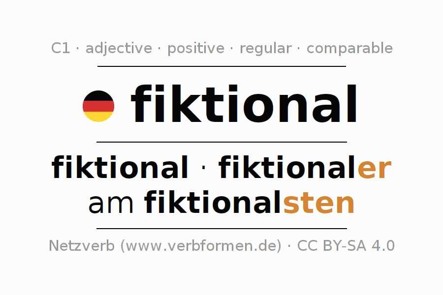 The declension of the adjective fiktional (fictional) uses these forms of the comparison fiktional,fiktionaler,am fiktionalsten. The endings for the comparison in the comparative and superlative are er/sten. The adjective fiktional can be used both attributively in front of a noun as well as predicative in conjunction with a verb.One can not only inflect and compare fiktional, but all German adjectives. Comments ☆