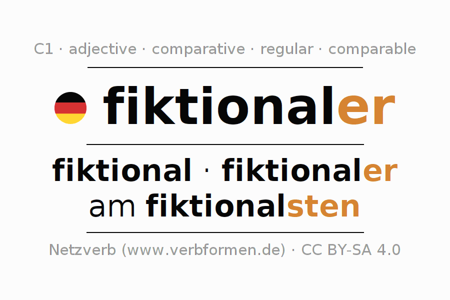 The declension of the adjective fiktionaler (fictional) uses these forms of the comparison fiktional,fiktionaler,am fiktionalsten. The endings for the comparison in the comparative and superlative are er/sten. The adjective fiktionaler can be used both attributively in front of a noun as well as predicative in conjunction with a verb.One can not only inflect and compare fiktionaler, but all German adjectives. Comments ☆