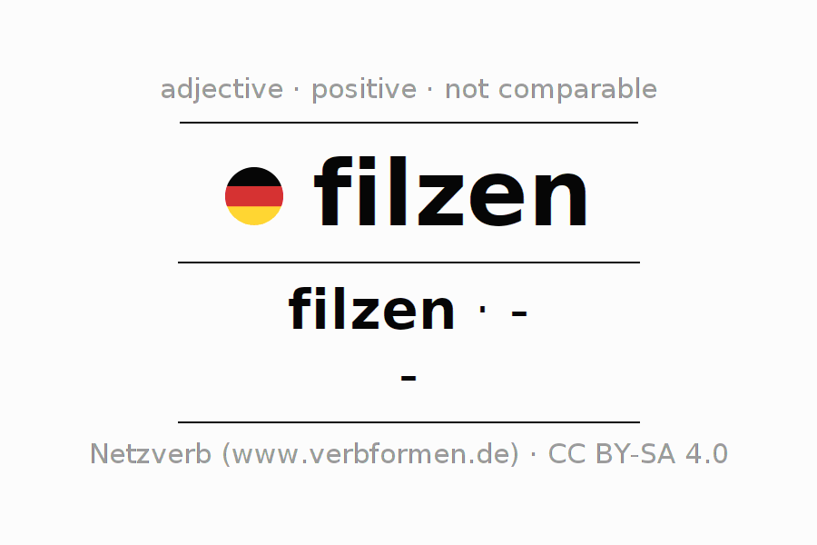The declension of the adjective filzen (felt-like, felted) uses the incomparable form filzen. The adjective has no forms for the comparative and superlative. The adjective filzen can be used both attributively in front of a noun as well as predicative in conjunction with a verb.One can not only inflect and compare filzen, but all German adjectives. Comments ☆