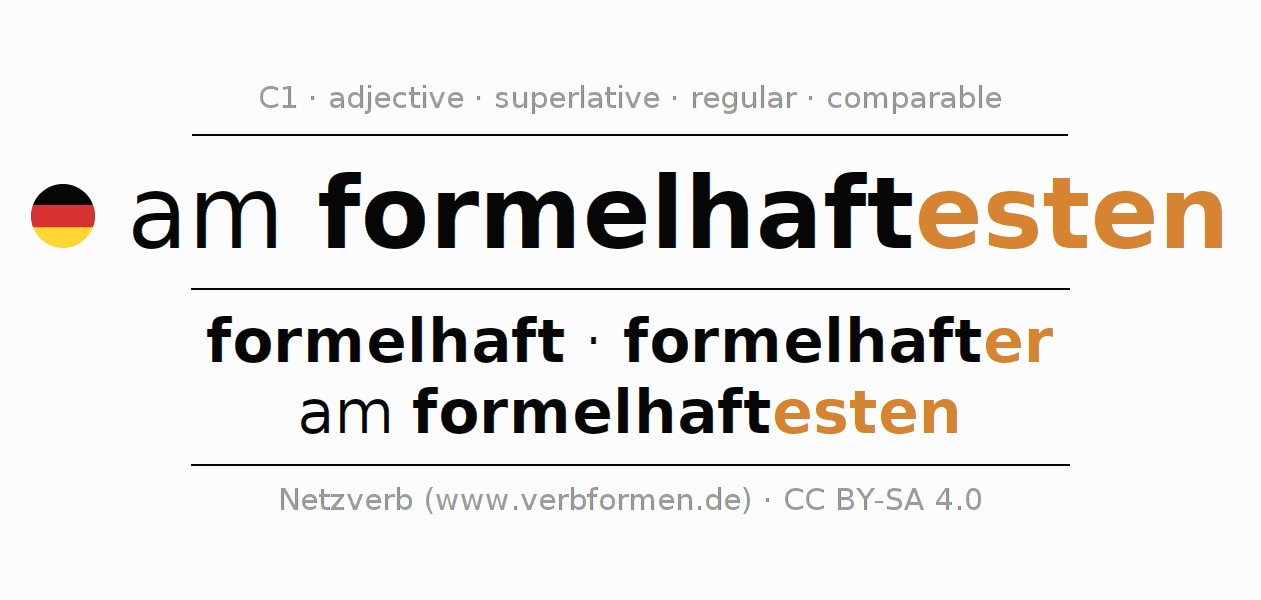 The declension of the adjective am formelhaftesten (formulaic) uses these forms of the comparison formelhaft,formelhafter,am formelhaftesten. The endings for the comparison in the comparative and superlative are er/esten. The adjective am formelhaftesten can be used both attributively in front of a noun as well as predicative in conjunction with a verb.One can not only inflect and compare am formelhaftesten, but all German adjectives. Comments ☆