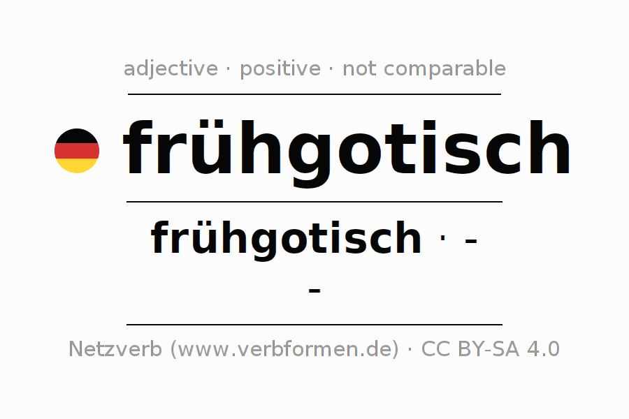 The declension of the adjective frühgotisch (early Gothic) uses the incomparable form frühgotisch. The adjective has no forms for the comparative and superlative. The adjective frühgotisch can be used both attributively in front of a noun as well as predicative in conjunction with a verb.One can not only inflect and compare frühgotisch, but all German adjectives. Comments ☆