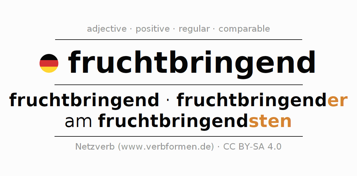 The declension of the adjective fruchtbringend (beneficial, fruitful) uses these forms of the comparison fruchtbringend,fruchtbringender,am fruchtbringendsten. The endings for the comparison in the comparative and superlative are er/sten. The adjective fruchtbringend can be used both attributively in front of a noun as well as predicative in conjunction with a verb.One can not only inflect and compare fruchtbringend, but all German adjectives. Comments ☆