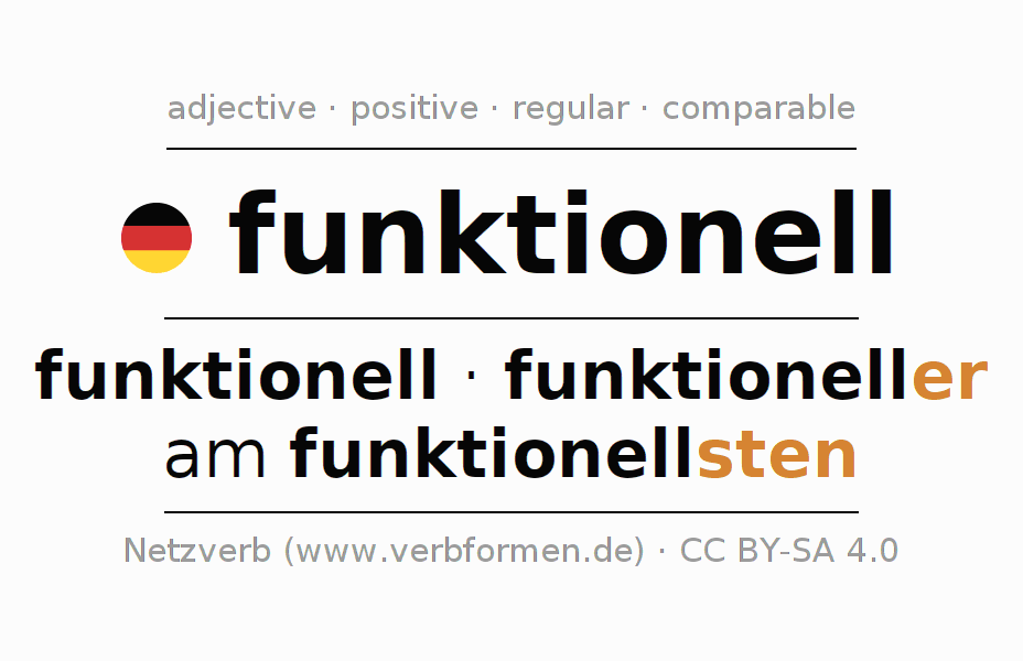 The declension of the adjective funktionell (functional, practical) uses these forms of the comparison funktionell,funktioneller,am funktionellsten. The endings for the comparison in the comparative and superlative are er/sten. The adjective funktionell can be used both attributively in front of a noun as well as predicative in conjunction with a verb.One can not only inflect and compare funktionell, but all German adjectives. Comments ☆