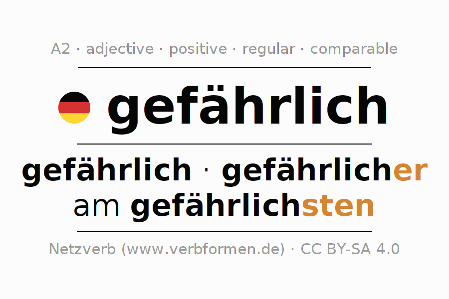The declension of the adjective gefährlich (dangerous, risky) uses these forms of the comparison gefährlich,gefährlicher,am gefährlichsten. The endings for the comparison in the comparative and superlative are er/sten. The adjective gefährlich can be used both attributively in front of a noun as well as predicative in conjunction with a verb.One can not only inflect and compare gefährlich, but all German adjectives. Comments ☆