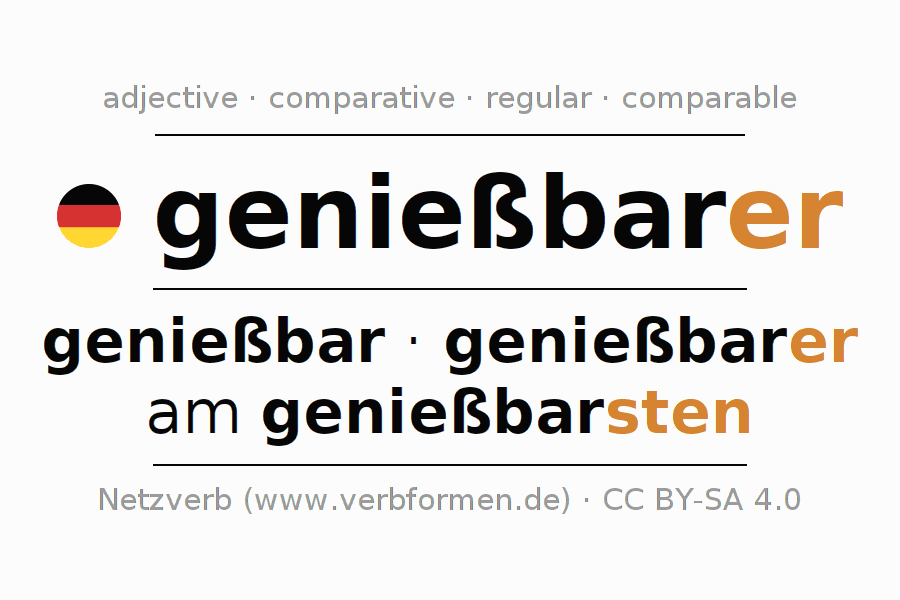 The declension of the adjective genießbarer (palatable, edible) uses these forms of the comparison genießbar,genießbarer,am genießbarsten. The endings for the comparison in the comparative and superlative are er/sten. The adjective genießbarer can be used both attributively in front of a noun as well as predicative in conjunction with a verb.One can not only inflect and compare genießbarer, but all German adjectives. Comments ☆