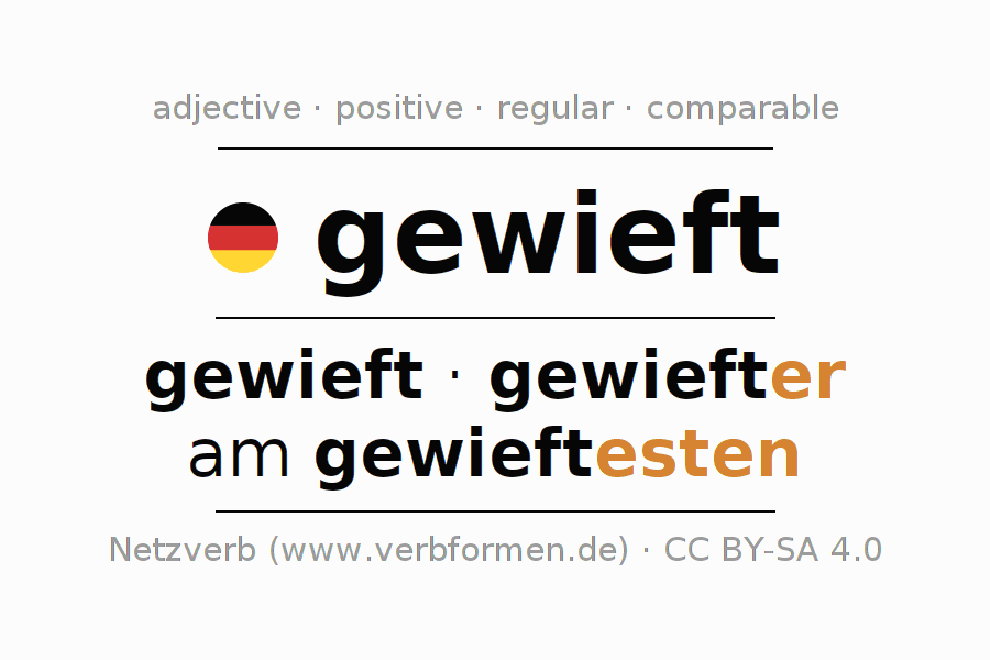 The declension and comparison of gewieft as declination and comparison tables with all strong, weak and mixed forms. These become clear as tables in the singular and plural and in all four cases nominative, genitive, dative and accusative.