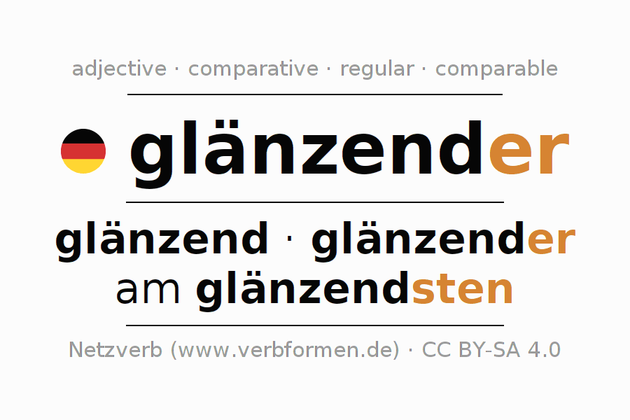 The declension of the adjective glänzender (brilliant, glossy) uses these forms of the comparison glänzend,glänzender,am glänzendsten. The endings for the comparison in the comparative and superlative are er/sten. The adjective glänzender can be used both attributively in front of a noun as well as predicative in conjunction with a verb.One can not only inflect and compare glänzender, but all German adjectives. Comments ☆