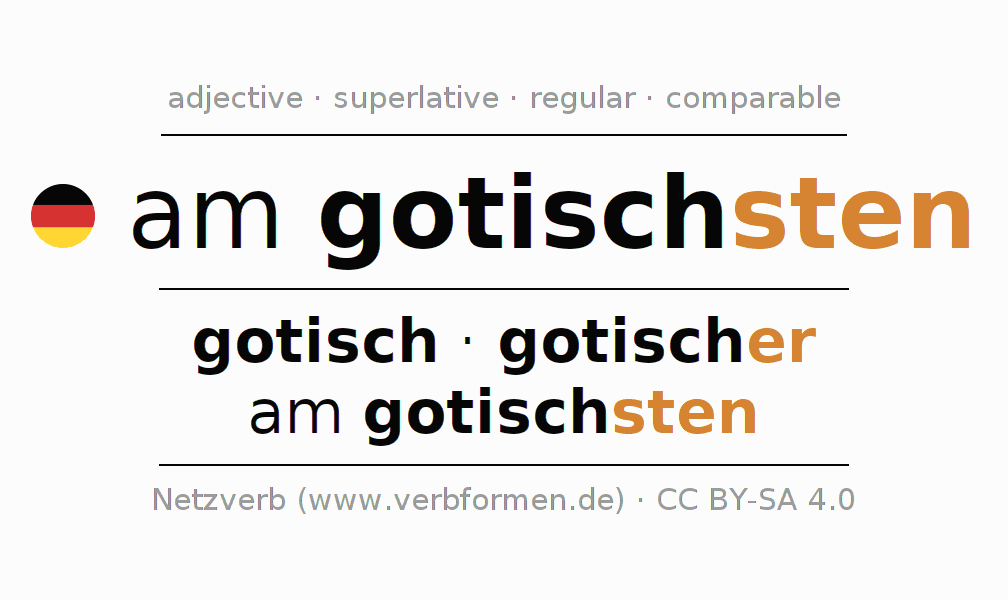 The declension of the adjective am gotischsten (Gothic, gothic) uses these forms of the comparison gotisch,gotischer,am gotischsten. The endings for the comparison in the comparative and superlative are er/sten. The adjective am gotischsten can be used both attributively in front of a noun as well as predicative in conjunction with a verb.One can not only inflect and compare am gotischsten, but all German adjectives. Comments ☆