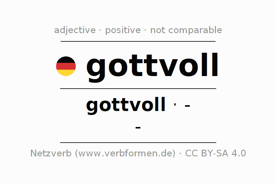 The declension of the adjective gottvoll (God-filled, devout) uses the incomparable form gottvoll. The adjective has no forms for the comparative and superlative. The adjective gottvoll can be used both attributively in front of a noun as well as predicative in conjunction with a verb.One can not only inflect and compare gottvoll, but all German adjectives. Comments ☆