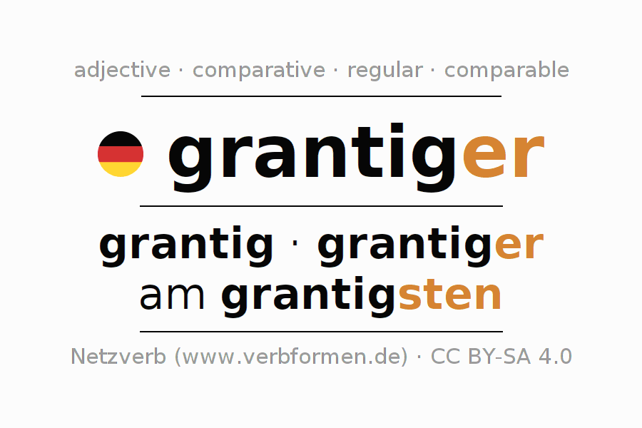 The declension of the adjective grantiger (grumpy, cross) uses these forms of the comparison grantig,grantiger,am grantigsten. The endings for the comparison in the comparative and superlative are er/sten. The adjective grantiger can be used both attributively in front of a noun as well as predicative in conjunction with a verb.One can not only inflect and compare grantiger, but all German adjectives. Comments ☆