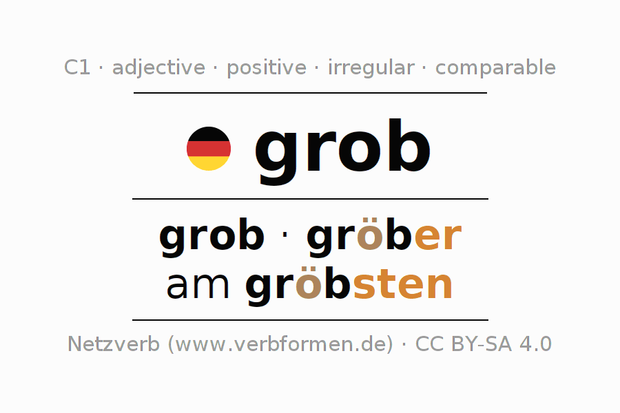 The declension of the adjective grob (rough, coarse) uses these forms of the comparison grob,gröber,am gröbsten. The endings for the comparison in the comparative and superlative are ö-er/ö-sten. The adjective grob can be used both attributively in front of a noun as well as predicative in conjunction with a verb.One can not only inflect and compare grob, but all German adjectives. Comments ☆