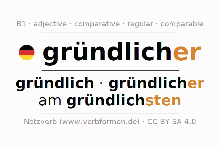 The declension of the adjective gründlicher (thorough, diligent) uses these forms of the comparison gründlich,gründlicher,am gründlichsten. The endings for the comparison in the comparative and superlative are er/sten. The adjective gründlicher can be used both attributively in front of a noun as well as predicative in conjunction with a verb.One can not only inflect and compare gründlicher, but all German adjectives. Comments ☆