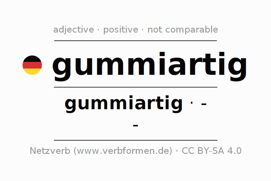 The declension of the adjective gummiartig (gum-like, rubbery) uses the incomparable form gummiartig. The adjective has no forms for the comparative and superlative. The adjective gummiartig can be used both attributively in front of a noun as well as predicative in conjunction with a verb.One can not only inflect and compare gummiartig, but all German adjectives. Comments ☆