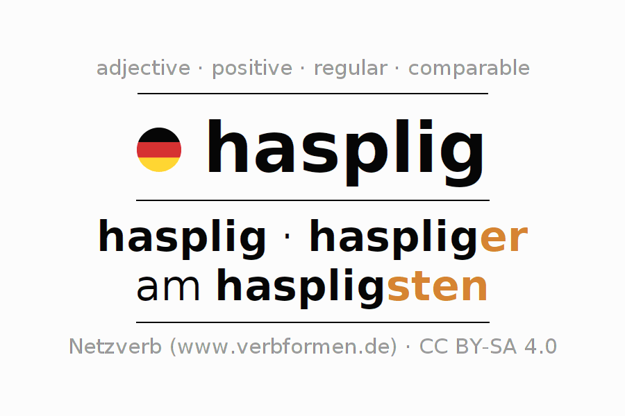 The declension of the adjective hasplig (clumsy, fidgety) uses these forms of the comparison hasplig,haspliger,am haspligsten. The endings for the comparison in the comparative and superlative are er/sten. The adjective hasplig can be used both attributively in front of a noun as well as predicative in conjunction with a verb.One can not only inflect and compare hasplig, but all German adjectives. Comments ☆