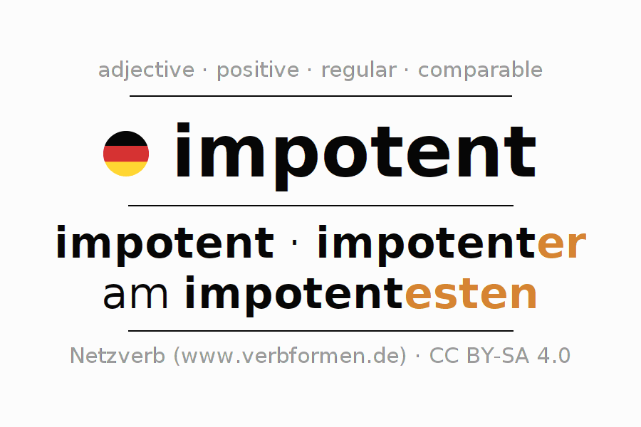 The declension of the adjective impotent (impotent, powerless) uses these forms of the comparison impotent,impotenter,am impotentesten. The endings for the comparison in the comparative and superlative are er/esten. The adjective impotent can be used both attributively in front of a noun as well as predicative in conjunction with a verb.One can not only inflect and compare impotent, but all German adjectives. Comments ☆