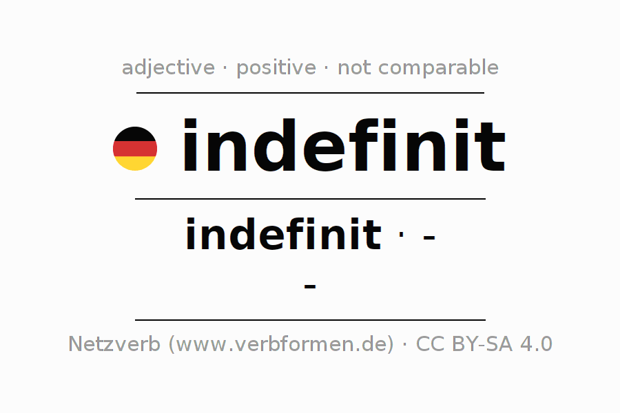 The declension of the adjective indefinit (indefinite, uncertain) uses the incomparable form indefinit. The adjective has no forms for the comparative and superlative. The adjective indefinit can be used both attributively in front of a noun as well as predicative in conjunction with a verb.One can not only inflect and compare indefinit, but all German adjectives. Comments ☆