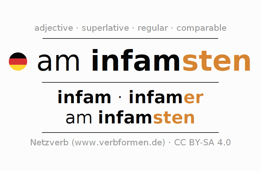 The declension of the adjective am infamsten (infamous, disgraceful) uses these forms of the comparison infam,infamer,am infamsten. The endings for the comparison in the comparative and superlative are er/sten. The adjective am infamsten can be used both attributively in front of a noun as well as predicative in conjunction with a verb.One can not only inflect and compare am infamsten, but all German adjectives. Comments ☆