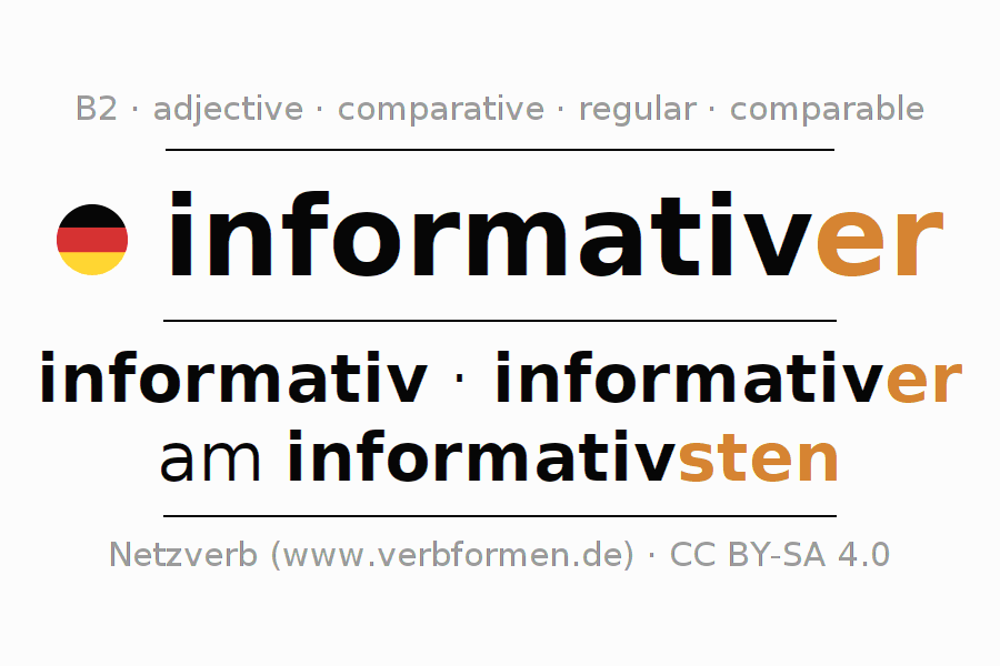 The declension of the adjective informativer (informative) uses these forms of the comparison informativ,informativer,am informativsten. The endings for the comparison in the comparative and superlative are er/sten. The adjective informativer can be used both attributively in front of a noun as well as predicative in conjunction with a verb.One can not only inflect and compare informativer, but all German adjectives. Comments ☆
