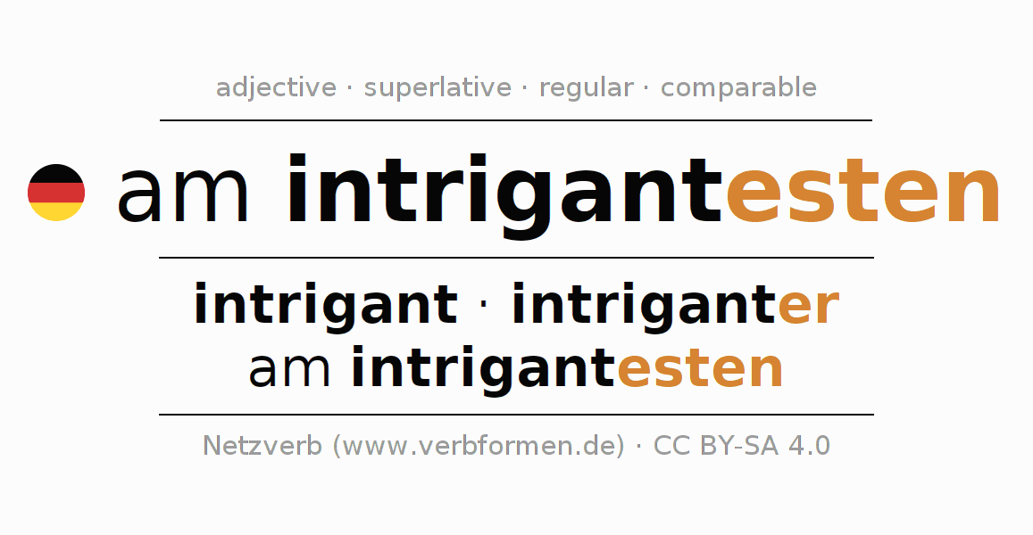 The declension of the adjective am intrigantesten (manipulative, scheming) uses these forms of the comparison intrigant,intriganter,am intrigantesten. The endings for the comparison in the comparative and superlative are er/esten. The adjective am intrigantesten can be used both attributively in front of a noun as well as predicative in conjunction with a verb.One can not only inflect and compare am intrigantesten, but all German adjectives. Comments ☆