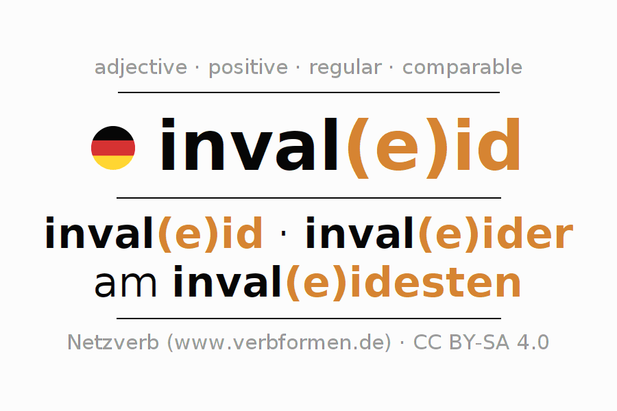The declension of the adjective invalid (void) uses these forms of the comparison invalid,invalider,am invalidesten. The endings for the comparison in the comparative and superlative are er/esten. The adjective invalid can be used both attributively in front of a noun as well as predicative in conjunction with a verb.One can not only inflect and compare invalid, but all German adjectives. Comments ☆