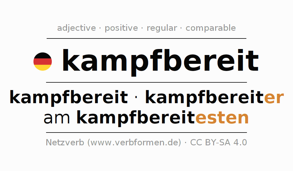 The declension of the adjective kampfbereit (combat-ready, prepared for battle) uses these forms of the comparison kampfbereit,kampfbereiter,am kampfbereitesten. The endings for the comparison in the comparative and superlative are er/esten. The adjective kampfbereit can be used both attributively in front of a noun as well as predicative in conjunction with a verb.One can not only inflect and compare kampfbereit, but all German adjectives. Comments ☆