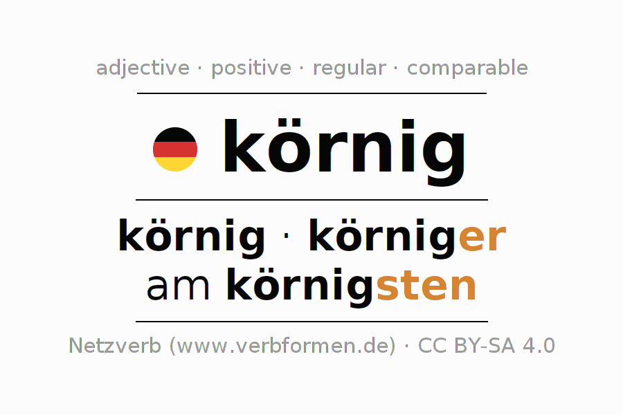 The declension of the adjective körnig (grainy, granular) uses these forms of the comparison körnig,körniger,am körnigsten. The endings for the comparison in the comparative and superlative are er/sten. The adjective körnig can be used both attributively in front of a noun as well as predicative in conjunction with a verb.One can not only inflect and compare körnig, but all German adjectives. Comments ☆