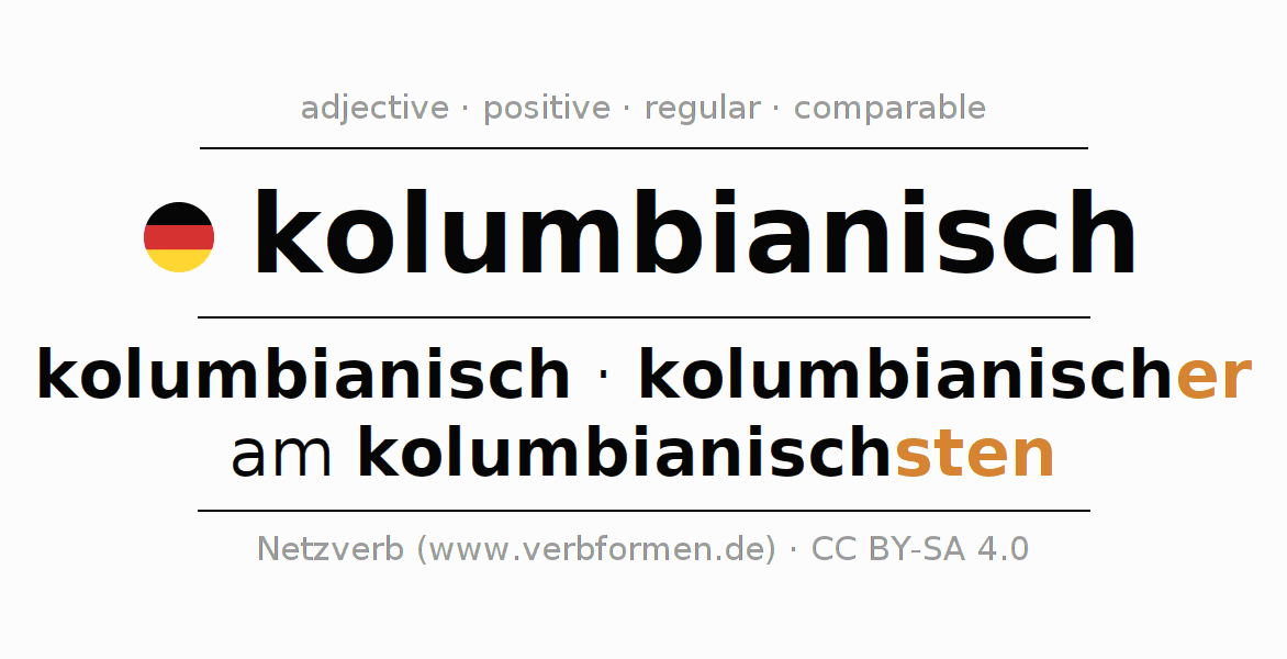 The declension and comparison of kolumbianisch as declination and comparison tables with all strong, weak and mixed forms. These become clear as tables in the singular and plural and in all four cases nominative, genitive, dative and accusative.