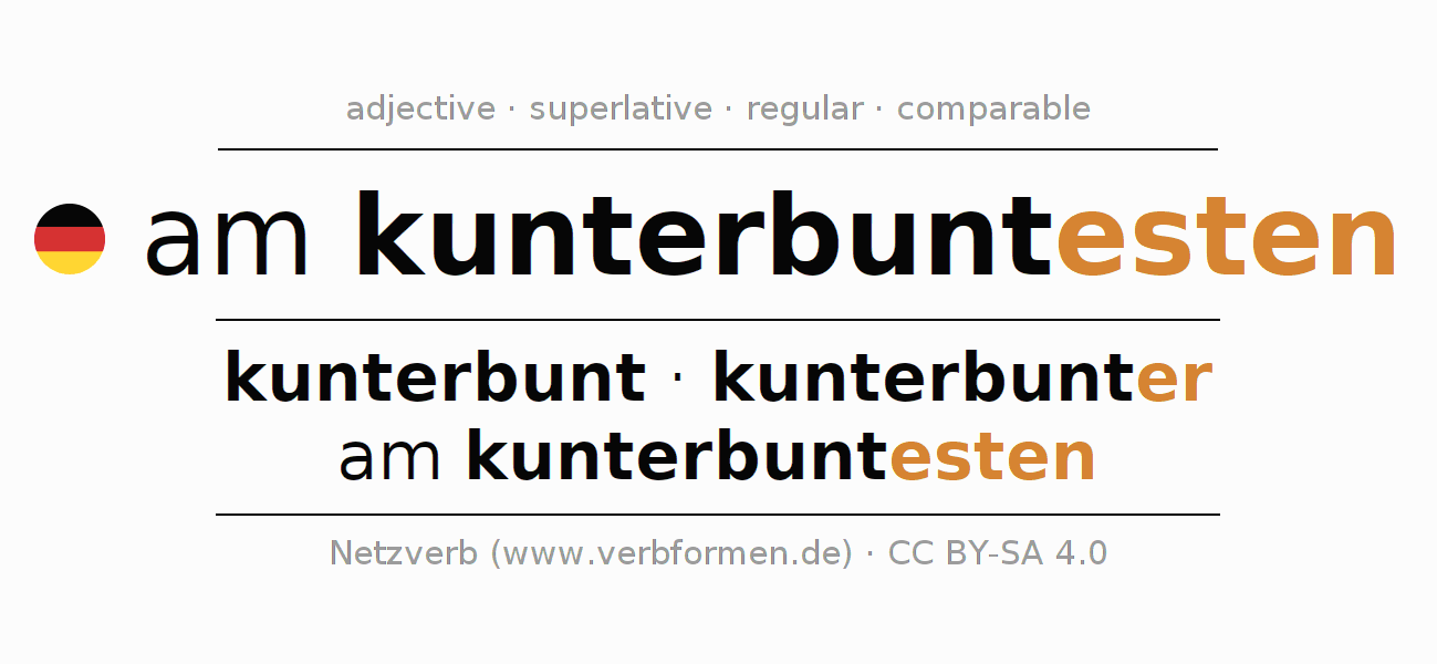 The declension of the adjective am kunterbuntesten (colorful, multicolored) uses these forms of the comparison kunterbunt,kunterbunter,am kunterbuntesten. The endings for the comparison in the comparative and superlative are er/esten. The adjective am kunterbuntesten can be used both attributively in front of a noun as well as predicative in conjunction with a verb.One can not only inflect and compare am kunterbuntesten, but all German adjectives. Comments ☆