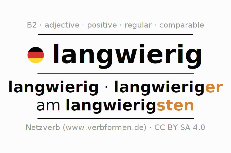 The declension of the adjective langwierig (lengthy, prolonged) uses these forms of the comparison langwierig,langwieriger,am langwierigsten. The endings for the comparison in the comparative and superlative are er/sten. The adjective langwierig can be used both attributively in front of a noun as well as predicative in conjunction with a verb.One can not only inflect and compare langwierig, but all German adjectives. Comments ☆