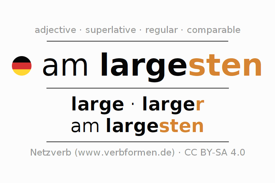 The declension of the adjective am largesten (generous, openhanded) uses these forms of the comparison large,larger,am largesten. The endings for the comparison in the comparative and superlative are r/sten. The adjective am largesten can be used both attributively in front of a noun as well as predicative in conjunction with a verb.One can not only inflect and compare am largesten, but all German adjectives. Comments ☆