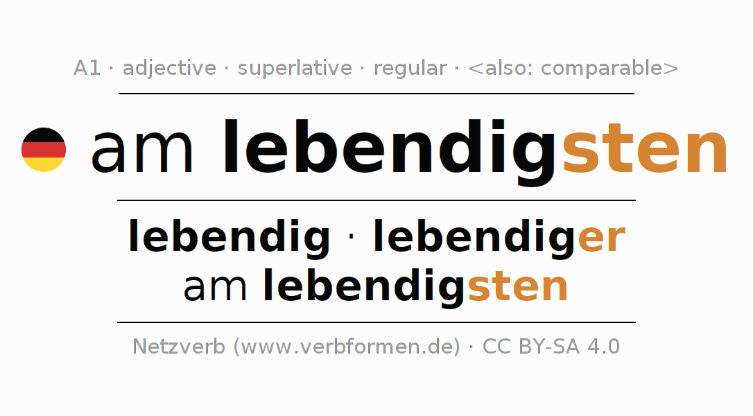 The declension of the adjective am lebendigsten (alive, vivid) uses these forms of the comparison lebendig,lebendiger,am lebendigsten. The endings for the comparison in the comparative and superlative are er/sten. The adjective am lebendigsten can be used both attributively in front of a noun as well as predicative in conjunction with a verb.One can not only inflect and compare am lebendigsten, but all German adjectives. Comments ☆