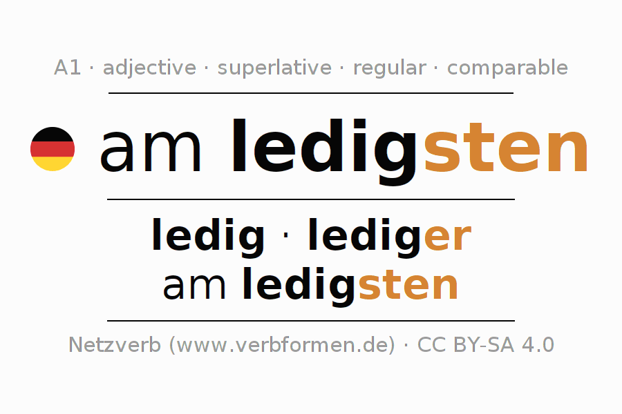 The declension of the adjective am ledigsten (single, free) uses these forms of the comparison ledig,lediger,am ledigsten. The endings for the comparison in the comparative and superlative are er/sten. The adjective am ledigsten can be used both attributively in front of a noun as well as predicative in conjunction with a verb.One can not only inflect and compare am ledigsten, but all German adjectives. Comments ☆