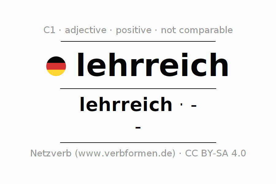 The declension of the adjective lehrreich (informative, instructive) uses the incomparable form lehrreich. The adjective has no forms for the comparative and superlative. The adjective lehrreich can be used both attributively in front of a noun as well as predicative in conjunction with a verb.One can not only inflect and compare lehrreich, but all German adjectives. Comments ☆