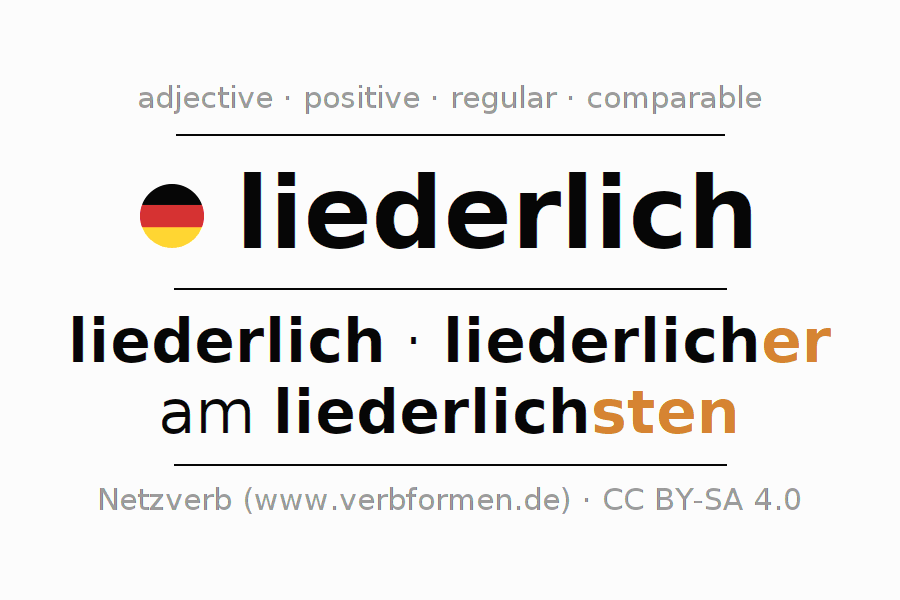 The declension of the adjective liederlich (sloppy, careless) uses these forms of the comparison liederlich,liederlicher,am liederlichsten. The endings for the comparison in the comparative and superlative are er/sten. The adjective liederlich can be used both attributively in front of a noun as well as predicative in conjunction with a verb.One can not only inflect and compare liederlich, but all German adjectives. Comments ☆