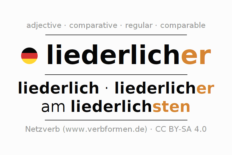 The declension of the adjective liederlicher (sloppy, careless) uses these forms of the comparison liederlich,liederlicher,am liederlichsten. The endings for the comparison in the comparative and superlative are er/sten. The adjective liederlicher can be used both attributively in front of a noun as well as predicative in conjunction with a verb.One can not only inflect and compare liederlicher, but all German adjectives. Comments ☆
