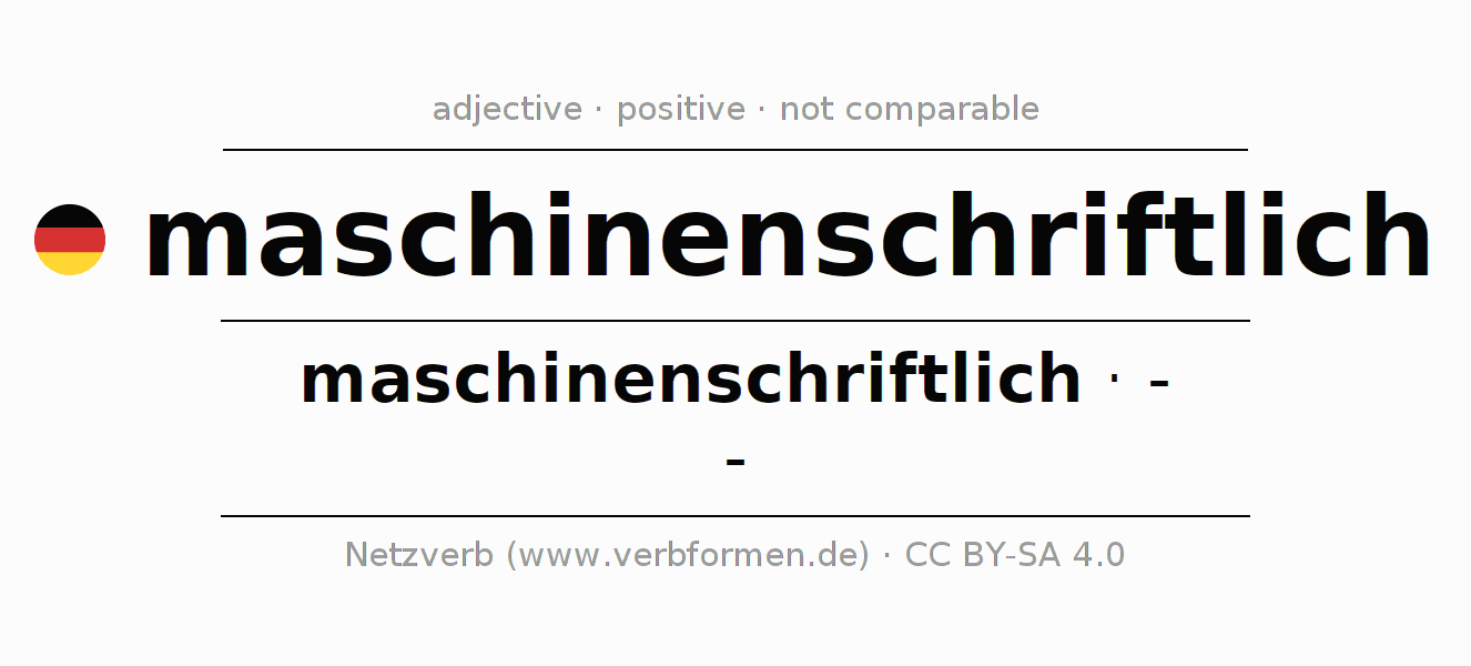 The declension of the adjective maschinenschriftlich (typewritten) uses the incomparable form maschinenschriftlich. The adjective has no forms for the comparative and superlative. The adjective maschinenschriftlich can be used both attributively in front of a noun as well as predicative in conjunction with a verb.One can not only inflect and compare maschinenschriftlich, but all German adjectives. Comments ☆