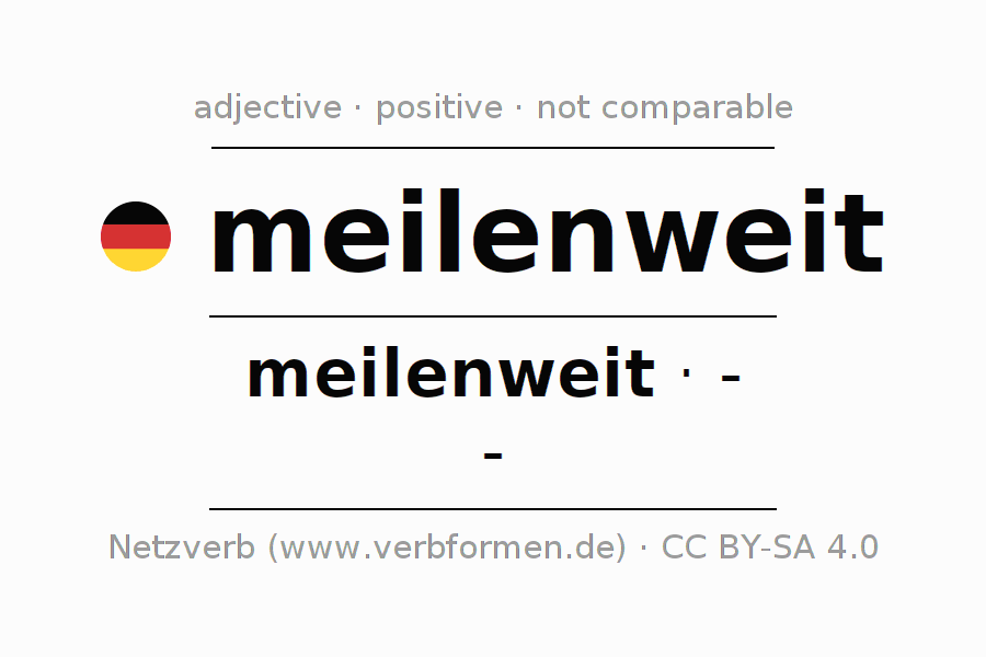 The declension of the adjective meilenweit (extremely far, far) uses the incomparable form meilenweit. The adjective has no forms for the comparative and superlative. The adjective meilenweit can be used both attributively in front of a noun as well as predicative in conjunction with a verb.One can not only inflect and compare meilenweit, but all German adjectives. Comments ☆